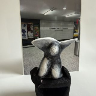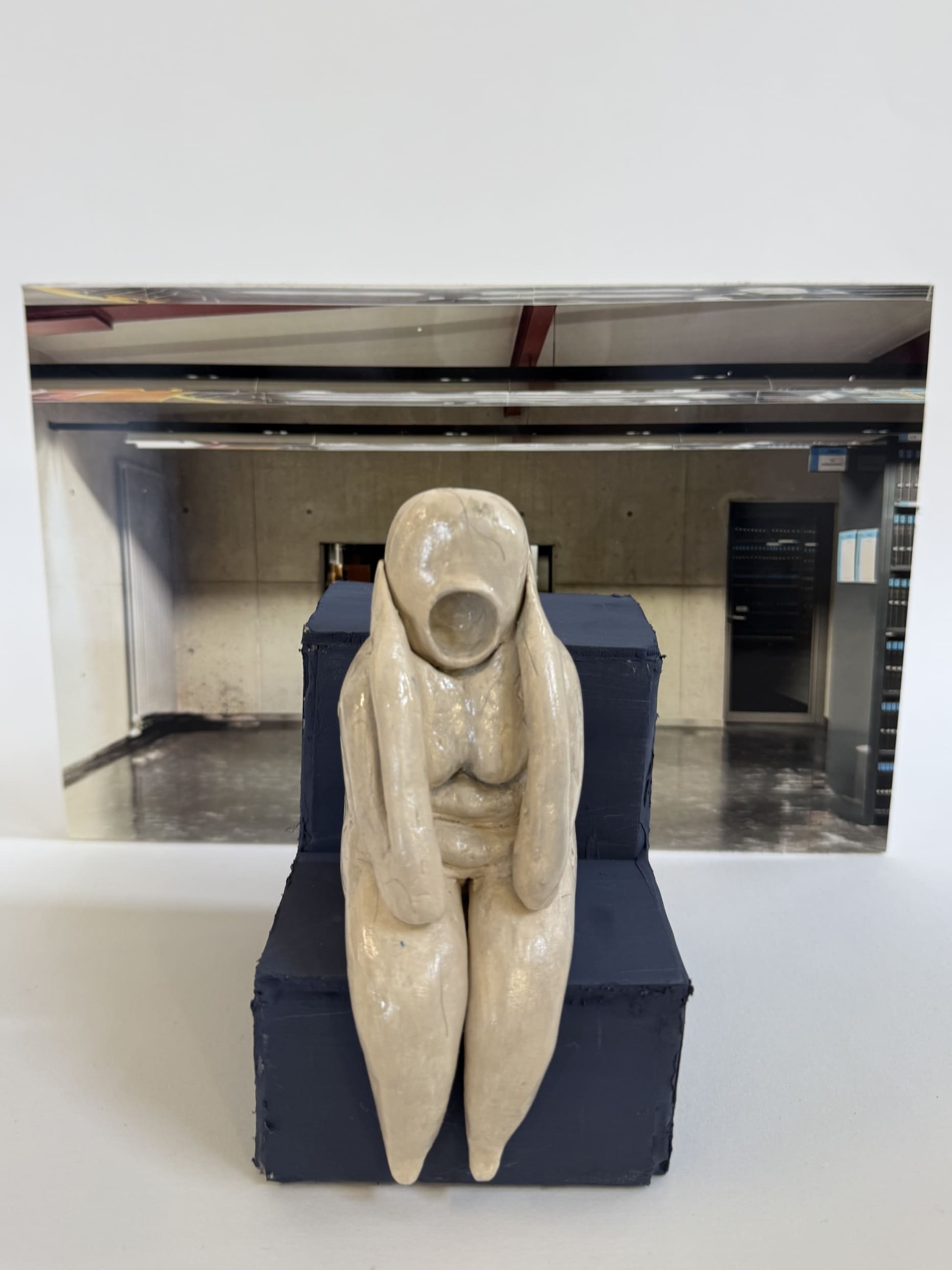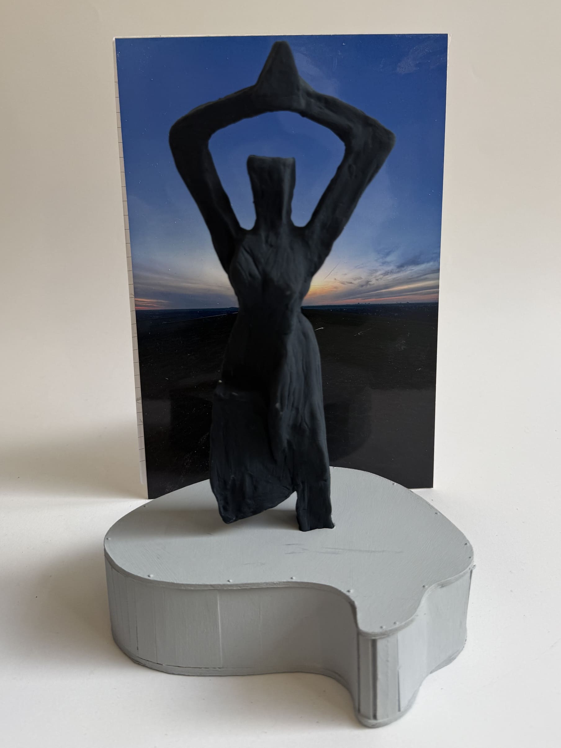 In Auseinandersetzung mit Künstler*innen abstrakter Plastik reduzierten wir die menschliche Figur in mehreren Zeichnungen auf ihre wesentlichen Merkmale. Aus der überzeugendsten Abstraktion entstand ein Bozzetto, das ausgearbeitet und bemalt wurde. Ergänzend gestalteten wir einen passenden, gleichberechtigten Sockel, der die Plastik nicht nur trägt, sondern ihre Aussage bewusst erweitert.